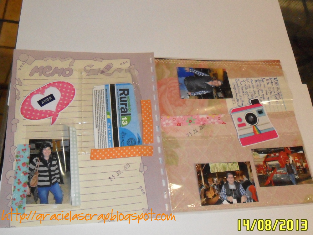Como mi agenda, libreta, cuaderno lo estoy fabricando yo , tomé unas hojas y un folio de oficina , lo corté y a máquina cosí en una hoja con diseño y en otra que encontré de una agenda vieja pegué los bolsillos con washi , recorte dos imprimibles, algunas fotografías , las entradas de la exposición y un journal escrito con nuestro paso por la Rural, la fecha es con sello fechador.-
